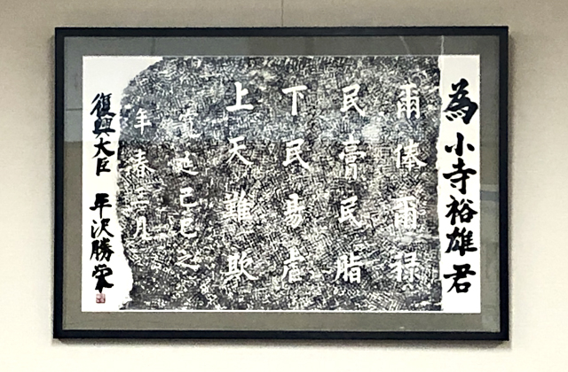 平沢勝栄復興大臣から戒石銘(かいせきめい)の拓本をいただきました。戒石銘とは福島県二本松城址にある花こう岩の大石に刻まれたもので、五代藩主丹羽高寛公が儒学者の岩井田昨非(いわいだ・さくひ)の進言により藩士の戒めとするために刻ませたものです。そして拓本とは、その戒石銘に和紙を被せて墨をうち写し取ったもので、二本松市長さんからいただかれた戒石銘の拓本を私にくださったのです。