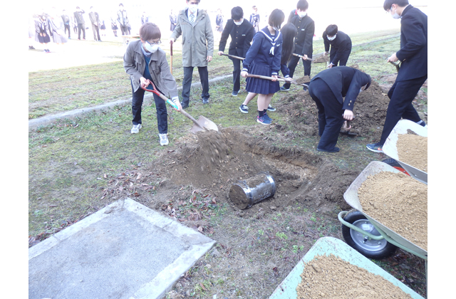 【東近江】 東近江市立五個荘中学校で22日、3月に卒業を迎える3年生とPTA役員らの手によってタイムカプセルが埋設された。