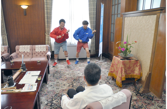「ノーサイン」の2人は、知事室で三日月知事に就任のあいさつをし、得意のリズムネタを披露。緊張した面持ちながら、知事室を和やかな雰囲気に包んだ。メンバーの乾さんは「子どもにも笑ってもらえるのがリズムネタのよさの一つ。小学校教員としての経験も生かし、県が取り組む『すまいる・あくしょん』などともつながるようなメッセージも発信できたら」と意気込み、北斗さんは「子どもからお年寄りまで、幅広い世代に笑いを届け、滋賀県から世の中を元気にしていきたい」と語った。
