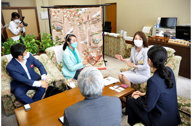 副知事室で製作の経緯を聞き、実際にそでを通した中條副知事は「思ったよりも軽くて驚いた。滋賀のいいところがぎゅっと詰まっているのがいい。結婚式で滋賀の魅力を知ってもらえる」と感心していた。