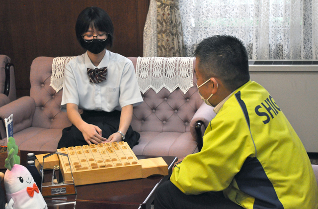 知事室で三日月知事に出迎えられた木村さんは日ごろの練習の様子や得意とする四間飛車などについて話し、「将来の夢は女流棋士になること」と語った。三日月知事は「夢の実現に向けて頑張ってください」とエールを送った。