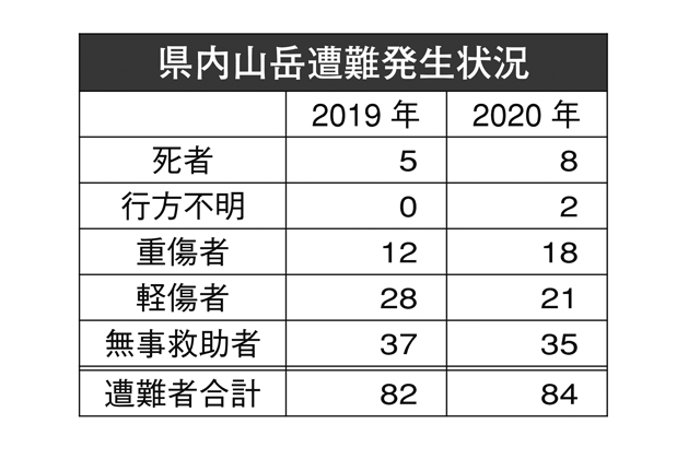 県警の「令和2年度山岳遭難白書」によると、昨年、県内で発生した山岳遭難は79件。遭難者の総数は84人でその内、死者8人、行方不明2人、重傷者18人、軽傷者21人だった(表参照)。また、過去10年間の山岳遭難件数と比べても昨年は、2018年の85件に次ぐ2番目の多さだった。