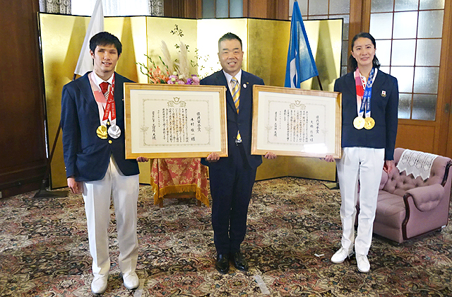 オリピックの金メダルとパラリンピックの金メダルが同時に揃うのは非常に貴重な機会です。おふたりには東近江市産ヤマザクラで制作した額縁に入れた表彰状と琵琶湖の水草で色付けされたガラス製花器を記念品としてお贈りいたしました。また副賞として、近江米や近江牛などの県産品、近江鉄道の特別乗車券などを贈呈し、県をあげておふたりの栄誉をたたえ、お祝いさせていただきました。