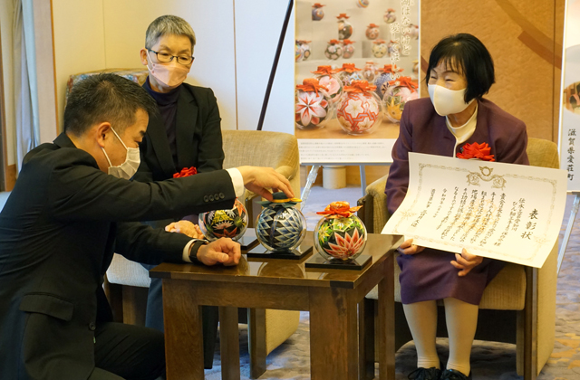 表彰を受けたことに対し、滋賀バルブ協同組合の濱口浩一理事長は「国内外で少しずつ実績を上げられたのは会員の総意と熱意のおかげ。これからも滋賀バルブ産業の普及拡大などに一層力を込めて取り組んでいきたい」と意気込み、伝承工芸愛知川びん細工手まり保存会の青木美江子副会長と辻史子副会長は「今後、びん細工手まりに新しい図柄を取り入れたり、よりきれいに見てもらえるようにしていきたいし、地域の若い人にも伝承を継承していきたい」と述べた。