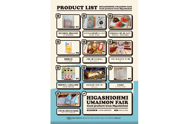 商品は、「東近江市産赤米 克勝あかね赤米」(滋賀報知新聞社)、「プレミアムかぶせ茶&煎茶 ティーバッグ」(近江銘茶武久商店)、「近江あかねキムチ」(滋賀第五営農組合)、「長寿揚げ天」(ワイガヤ本舗)、「八香一味とうがらし」(蔵・Lerond・K)、「ステーキスパイス十一味」(eN)、「琵琶湖の味をギュッと詰め込んだ調味料」(日本料理魚繁大王殿)、「カミロコチーズケーキ」(Kami―Loco)、「ひの気分」(アーキオフィス大光)、「子供が喜ぶ便利な形の給食袋」(カラーショップPolka―Dot)。