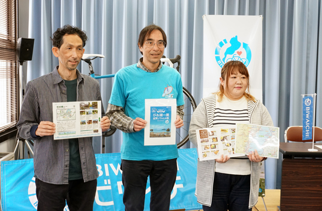 このほど、藤本会長ら出版に携わった人たちの代表者らが県庁で出版記念記者会見を開いた。藤本会長は「ビワイチは、早い人だと日帰りで走破してしまうが、それはもったいない」とし「もっとゆっくり、できれば宿泊しながら滋賀の良さを知ってほしいし、県民にも身近な地域を見直してもらえるきっかけの一冊になれば」と期待を語った。