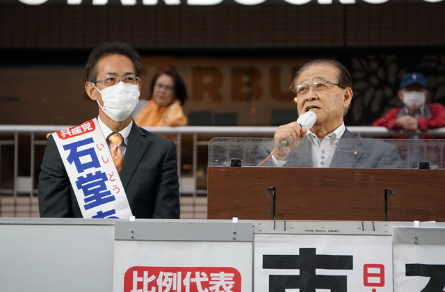 一方、共産党の市田副委員長は、同党公認で滋賀選挙区から出馬する意向を示している新人の石堂淳士氏(48)と比例で出馬する意向の同党現職(4期)・大門実紀史氏(66)と共に街宣車に立った。市田副委員長は憲法9条を生かして平和を作るために「国連憲章に基づく団結で戦争を終わらせよう」「核兵器のない世界を」「危機に乗じて戦争する国づくりを止めさせよう」「東アジアを平和な地域に」の4点を呼びかけ「比例は党のベストメンバー5人全員を、滋賀の代表は真の野党候補、石堂さんを国会へ送ってほしい」と語った。