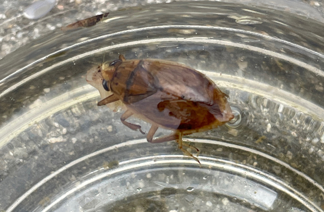 昆虫好きの小学4年生、藤田幸喜さん(9)=東近江市平田町=が見つけたのは、コオイムシ(カメムシ目コオイムシ科)という水生昆虫。藤田さんが通う八日市西小学校のビオトープで発見した。