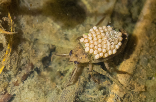 コオイムシはその名の通り、卵を背中に乗せて孵化まで守る生態から「子を背負う虫」が由来であると言われ、卵を背負うのは雄であることから通称昆虫界のイクメンとも呼ばれる。