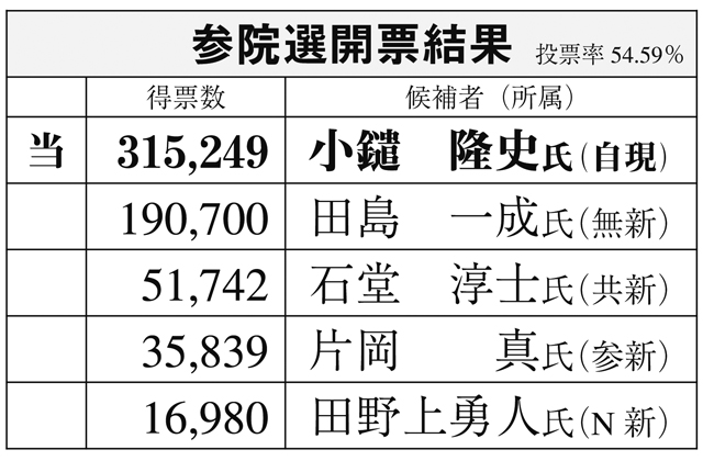 今回の参院選は、野党候補が一本化された前回から一転して共闘が成立せず、小鑓氏に無所属新人の田島一成氏(立民、国民推薦)と共産新人の石堂淳士氏らが挑む構図となったが、及ばなかった。