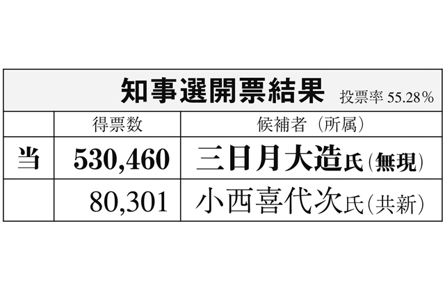 開票結果は、三日月氏が53万460票、小西氏が8万301票を得票。投票率は55・28%で前回(40・62%)を上回った。