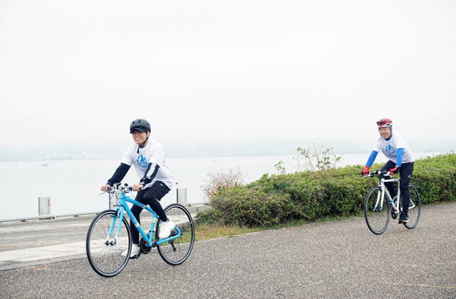 1回目の今年は、三日月知事と西川大使が烏丸半島(草津市下物町)から「BIWAKO」モニュメント(守山市今浜町)までの約9キロメートルの湖岸沿いを自転車で走行した。ビワイチTシャツを身につけた三日月知事と西川大使は、会話を楽しみながら自転車を走らせ、途中、ピエリ守山(同)に設けられたエイドステーション(休憩所)の体験を挟みながら、約1時間かけて完走した。