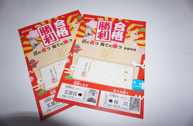 合格勝利きっぷは700円(税込み)で、来年3月31日まで彦根、八日市、近江八幡、貴生川の4駅で発売されているほか、通信販売(https://www.ohmitetudo.co.jp/railway/fan/goods/)でも申し込める。