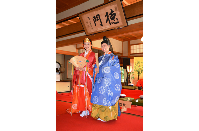 今年は、東近江市の観光PR大使「東近江市レインボー大使」の2人がお雛様になりきり、地元の淡海書道専門学校の学生が三人官女と五人囃子(ばやし)を務めた。十二単など鮮やかな衣装を身にまとったひな人形たちは来館者が向ける多くのカメラに笑顔で応え、愛嬌を振りまいていた。