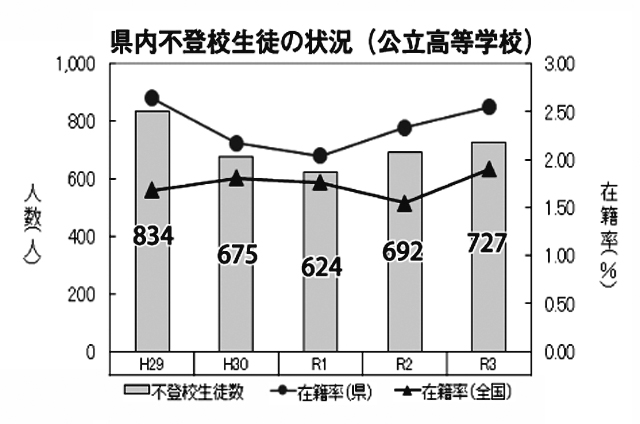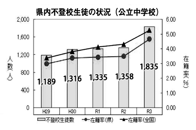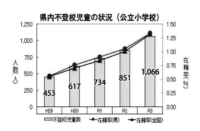 県内の不登校児童・生徒数は公立学校の全校種で増加傾向をたどっており、2021年度の文科省調査では過去最多となった。