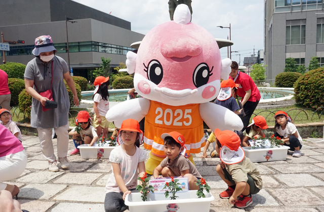 園児らと一緒に定植した大杉副知事は「花いっぱいで国スポ・障スポを迎えようというチャッフィーの思いが園児たちにも伝わり、大会のことを次世代に伝えていくいい機会になった」と語った。