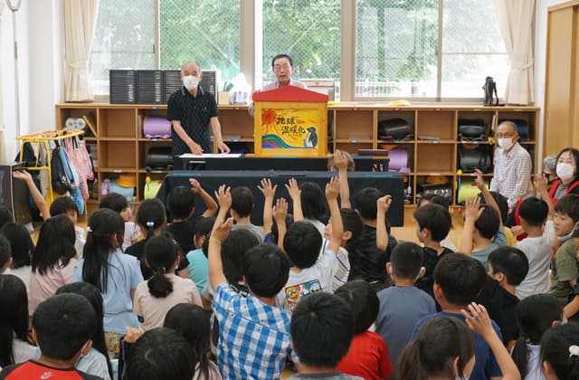 紙芝居は地元の読み聞かせグループ「にこにこくらぶ」が上演。「地球が暑くなるとどうなるかな」と子どもたちに語りかけるように講演し、「まずはできることから頑張っていくことが大切」と伝えた。子どもたちは、時折、問いかけに相槌を打ちながら真剣に聞き入っていた。