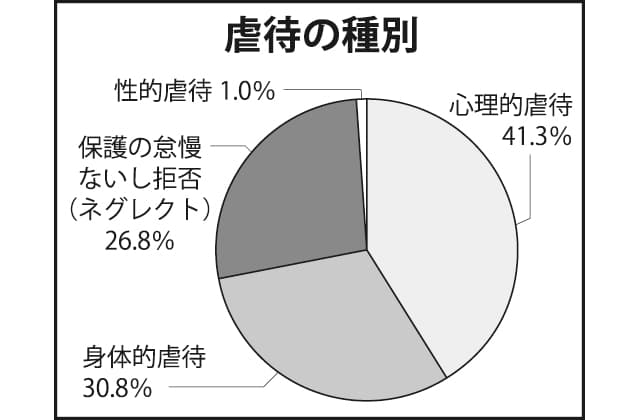 虐待の種別では、「心理的虐待」が3265件(41・3%)で最も多く、続いて「身体的虐待」が2434件(30・8%)、「保護の怠慢ないし拒否(ネグレクト)」が2121件(26・8%)、「性的虐待」が81件(1・0%)となった(グラフ参照)。また、前年度比では、「心理的虐待」が168件、「身体的虐待」が164件、「保護の怠慢ないし拒否(ネグレクト)」が69件それぞれ減少した一方、「性的虐待」は1件増加した。