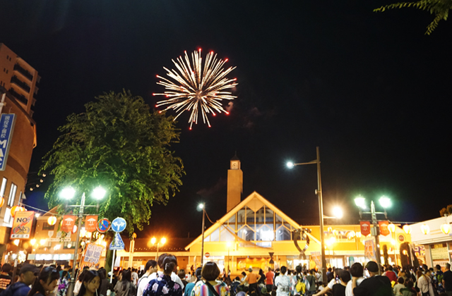 観光花火大会では、延命山から大花火が打ち上げられた。駅前にぎっしりつめかけた観衆は、赤や緑、青などの色とりどりの大輪の花火が迫力とともに夜空を彩るたびに、歓声と拍手を上げていた。