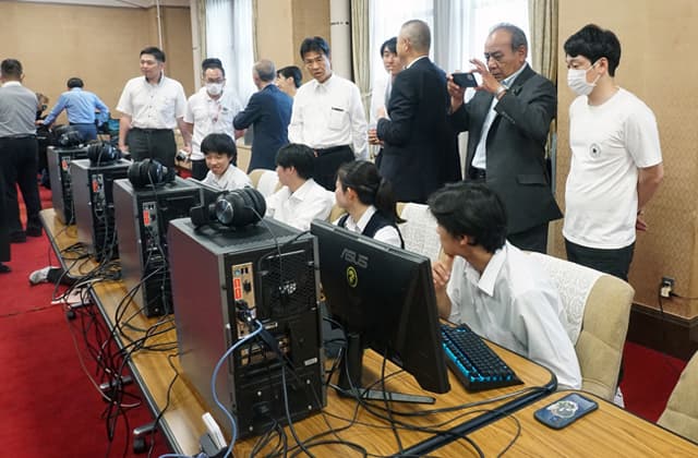 【県】 「eスポーツ」への理解促進を図ることを目的に、このほど県庁で県議会議員らと三日月大造知事が県立近江八幡工業高校eスポーツ部から教わりながら実際に体験する研修会が開かれた。