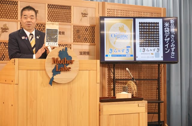 「きらみずき」は、生産者が作りやすく、より安全・安心でおいしい近江米の新品種として県が2009年から開発に取り組み、21年に高温に強く、倒れにくく、大粒でコシヒカリ以上の食味と収量が期待できる中生(なかて)品種として誕生した。近江米新品種として公募した名称で市場に流通するのは「みずかがみ」以来10年ぶりとなる。