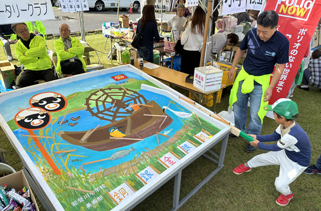 五個荘能登川ロータリークラブ(大橋史和会長)のブースでは、地元の能登川中学校美術部が制作したスマートボールが初披露された。子どもたちにイベントを楽しんでもらおうと、同クラブでは景品付きのスマートボールを毎年開いており、今回新調するにあたり、同中学校美術部にボードの絵柄を依頼した。