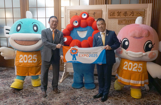【県】 2025年に大阪を主会場に開催される「2025年日本国際博覧会(大阪・関西万博)」への機運を高めることを目的に、このほど開催運営を担う公益社団法人2025年日本国際博覧会協会の堺井啓公担当局長(中小企業・地域連携)と大阪・関西万博公式キャラクターのミャクミャクが県庁で三日月大造知事を表敬訪問した。