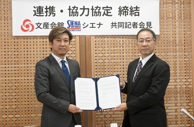 【全県】 開館35周年を迎えた県立文化産業交流会館(米原市下多良2)を管理する公益財団法人びわ湖芸術文化財団(大津市打出浜)は、世界的指揮者として活躍している佐渡裕氏が首席指揮者を務める日本を代表する吹奏楽団「シエナ・ウインド・オーケスラ」を運営する一般社団法人ジャパン・シンフォニック・ウインズ(東京都新宿区)とこのほど連携・協力協定を締結した。吹奏楽を通じた今後の湖北地域の活性化に期待が高まっている。