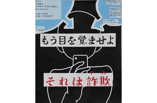 最優秀に選ばれた吉田さん(美術部員)は「詐欺に騙されないで欲しいという気持ちで描きました。図案を考えるのに3日ぐらい、描くのに1週間ぐらいかかりました。うまく描けなかったところもあるが、詐欺がなくなってほしい願いを込めました」と述べた。入賞作品は、詐欺被害防止の啓発活動に役立てられる。