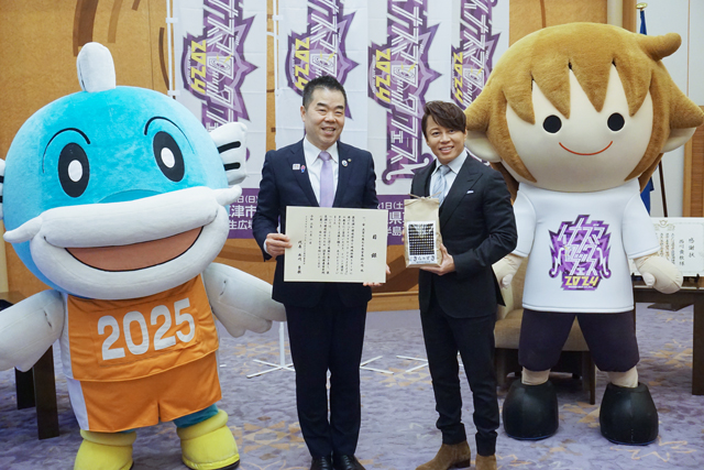 【県】 歌手で県ふるさと観光大使の西川貴教さんがこのほど県公館(大津市京町4)を訪問し、昨年10月に烏丸半島(草津市下物町)で開催した「イナズマロックフェス2023」の収益の一部を滋賀応援寄附へ寄付し、県からお礼の品として近江米「きらみずき」が贈られた。また、西川大使が県立琵琶湖博物館(同)の水族展示再生支援寄付を実施したことに対する感謝状も同日合わせて贈られた。