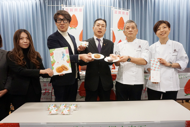 県やJA全農しがなどの農業関係団体などで構成する滋賀県園芸農産振興協議会がこのほど県庁で記者会見を開き、「みおしずく」の新作スイーツについてPRした。