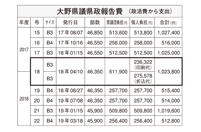 支出を見ると、表の太枠の通り、17年度の大野氏の政活費から印刷代として23万6322円、18年度の同氏の政活費から折込み代として27万5578円がそれぞれ支出され、合計額は51万1900万円に上る。