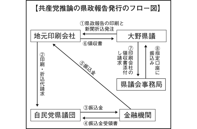 さらに「図の通り政活費収支報告書に添付されている証拠書類は、会派負担分が金融機関の振込金受領書、大野氏の個人負担分が印刷会社からの領収書である。会派から振り込まれた金額に対し印刷会社から領収書が発行され、それが大野氏個人の証拠書類になっているのではないか。17年度~20年度計16回すべての県政報告において同様の処理がなされた(2重請求)疑惑がある」とし、同党県議団は大津地検に刑事告発した。