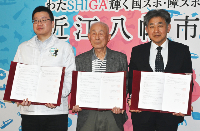 【近江八幡】近江八幡市は4日、同市西庄町の大型スーパー・バロー近江八幡店駐車場にある災害対応型コインランドリー「ブルースカイランドリー」を運営している(株)ジーアイビー、金田学区まちづくり協議会の3者間で「災害時における防災資機材等の提供に関する協定」を締結した。