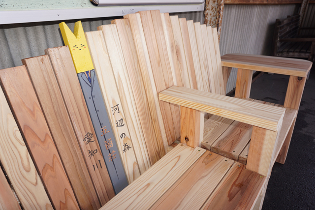 団体には約90人の学生が通い、木工建築などを学びながら社会貢献活動にも日々励んでいる。同協議会から制作の依頼を受け、昨年12月から各班に分かれ、ホームに設置するベンチやモニュメントのデザインを協議してきた。その一つ「近江巡り」と名付けたベンチには、背もたれ部分を本線25駅に合わせ板25枚で固定し、駅名とともに近江鉄道のマスコットキャラクター「駅長がちゃこん」をあしらった。そのほかにも近江鉄道の車両をイメージしたベンチなど合計23脚を今年2月に完成させた。