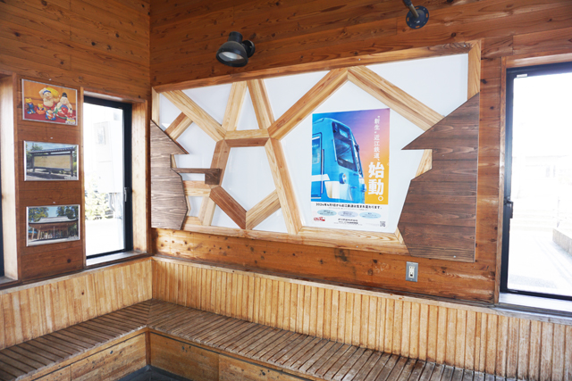 この取り組みは、近江鉄道線地域公共交通安全再生協議会(会長・三日月大造滋賀県知事)が滋賀県産材の木材を活用した駅待合環境整備の一つで、官学連携プロジェクトとして同大学の環境科学部環境建築デザイン学科の学生ら有志で構成される団体「多賀木匠塾」と共同で制作したもの。