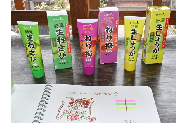 また、弁当に入っている魚の形をした醤油さしや食卓に並ぶ生わさびやねり梅、生しょうがのチューブデザインをそのままに文房具(色マーカー)として使う企業製品も展示され、見る側に認識を覆す驚きと楽しさを提供している。