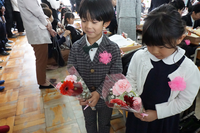 日野小学校では入学式のあと、教室で新入生に花束と文房具を配布した。
