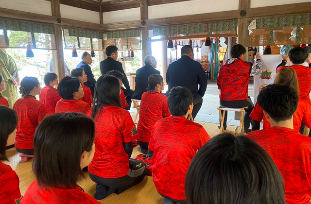 創部7年目となるバイオレッツの今年のスローガンは「A new breeze~進めその先へ 新たなる風を~」。未だ成し遂げていない目標に向かって進み、新しい風を吹かせるという思いを込め選手らで決めた。この日、毎年恒例となっている太郎坊宮に今年所属の選手20人と監督、関係者らが足を運び必勝を祈願。東近江江州音頭普及愛好会からバイオレッツを応援する江州音頭が披露されたほか、太郎坊宮崇敬会から必勝を願った凧も贈られ、地元の応援を背に受けた。