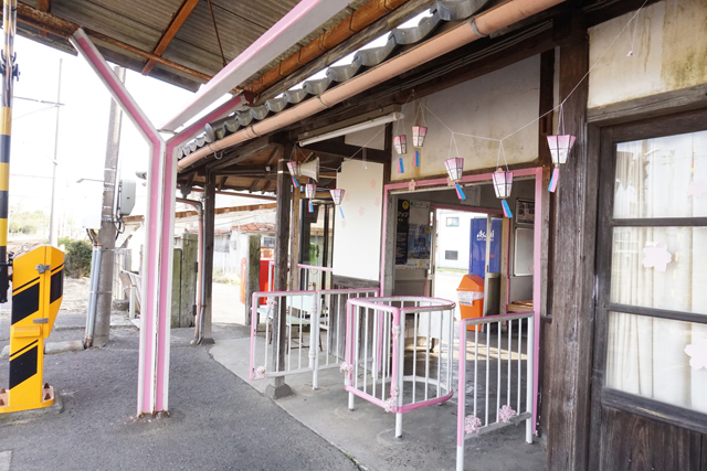 【東近江】 桜川駅活性化プロジェクトチームはこのほど、近江鉄道桜川駅に春らんまんの華やかな飾りつけを施し、利用者の目を楽しませている。
