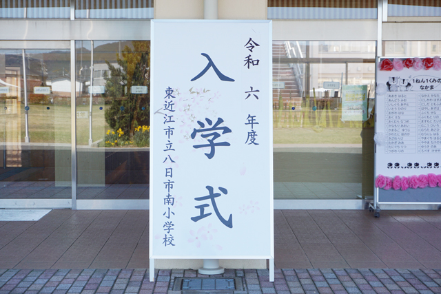 同市沖野3丁目、八日市南小学校(児童数518人)の入学式では、胸に赤いコサージュをつけた新1年生85人が、6年生に手をつながれて緊張した面持ちで入場。教員や保護者、上級生の大きな拍手に迎えられた。そして担任教諭から1人1人の名前が呼ばれると、「はい」と元気よく返事をしていた。