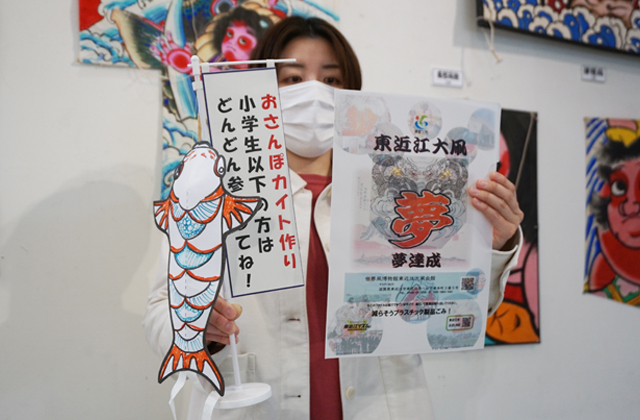 【東近江】 鬼若丸(弁慶の幼名)が巨大な鯉を退治した勇猛果敢な逸話を描いた高さ3・5メートルの凧や、力持ちの金太郎が鯉を捕まえた絵柄の凧など、端午の節句に合わせた鯉の凧展が東近江大凧会館で開かれている。元気で強い子に育ってほしいとの願いが込められた全国の伝統凧27点を展示。「恋(鯉)に芽生える」との意味を持たせた東近江大凧なども展示され、恋のパワースポットとしても来館者を楽しませている。期間中は、小学生以下を対象に簡単な鯉のカイト作りが無料で体験できるほか、来館者にはオリジナルのクリアファイルも先着100人に進呈される。鳥居勝久館長は「縁起が良く、力強い鯉の凧を見てゴールデンウィークを満喫してほしい」と話す。展示は5月6日まで。期間中の休館日は4月23日、24日、30日、5月1日。入館料300円、小中学生150円。