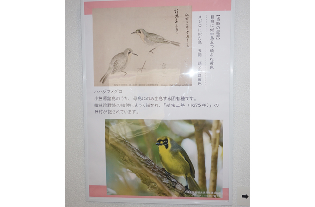 このほか、同諸島は海底火山が噴火して隆起してできた海洋島で、一度も大陸と地続きになったことがなく、固有種が多い。生きものの記録では、小鳥の「ハハジマメグロ」を狩野派の絵師に描かせており、「メジロに似た鳥 五羽 頭と胸は黄」と記述している。