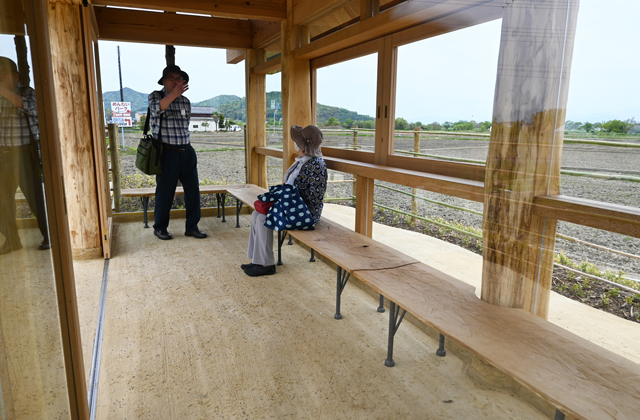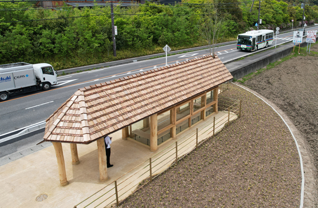 完成した待合所は、目前に広がる田園風景が楽しめるよう自然と調和した木造のデザインで、11本の柱に太い栗材(岐阜高山産)、梁と桁、束には滋賀県産の杉材が使われている。屋根はレッドシダー(アメリカヒノキ科材)の厚い板材が瓦のように葺かれている。また、解放された片方の屋根端から突き出るように高さ約6・5メートルのシラカシの木が植えられている。敷地は市有地で面積約254平方メートル。田んぼからの盛土のり面には「おかめ笹」が敷き詰められている。
