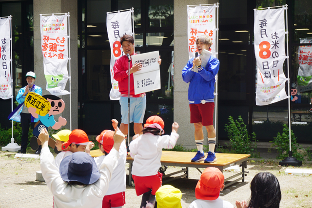 また、吉本興業所属のお笑い芸人で滋賀県住みます芸人として活躍するノーサインの2人も応援に駆けつけ、イベント進行に務めた。来場した地元の建部幼稚園の園児にお米クイズを出題などし、園児らも元気いっぱいに答えながら地元でつくられた米に親しんだ。その後園児らは、炊きあがったできたてのご飯でおむすびに挑戦。「おいしくなあれ」と声をかけながら三角になるよう丁寧ににぎり、口いっぱいに頬張り笑顔を見せていた。