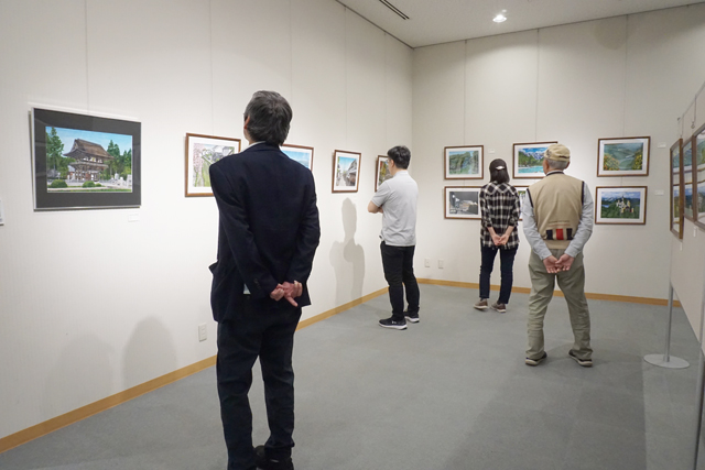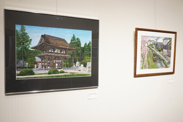 2人の親子作品展は今回が初めて。滋さんは苗村神社(竜王町)の楼門や八幡堀(近江八幡市)、五個荘金堂の街並み(東近江市)、金剛輪寺(愛荘町)など、県内各所をまわって考えた自分なりの「近江名所旧跡10景」(歌川広重の近江八景に着想)ほかアクリル画16点を展示。陽子さんはイラストを担当した絵本「空とぶうさぎ」(文芸社)の原画や好きな動物といううさぎのデッサン画など、約20点を並べている。