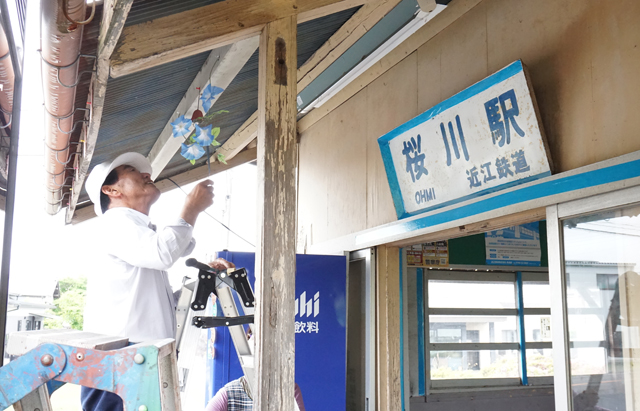 【東近江】 桜川駅活性化プロジェクトチームはこのほど、近江鉄道桜川駅に夏らしい涼やかな飾りつけを施し、利用者を楽しませている。