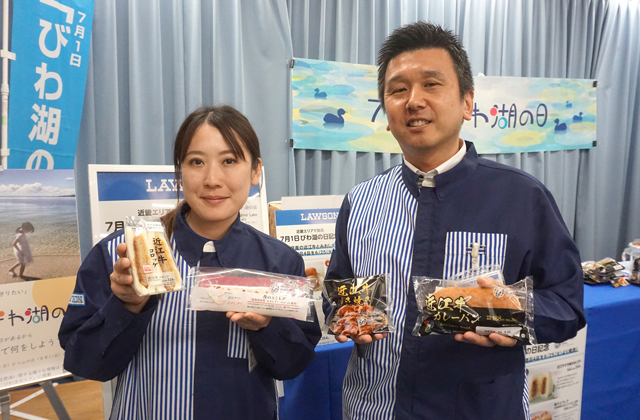【全県】 県と連携協定を締結しているローソン(本社・東京都品川区)と平和堂(本社・彦根市西今町)が7月1日の「びわ湖の日」にちなみ、県産食材を用いた「びわ湖の日」記念商品を期間限定で販売する。