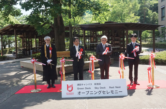 【大津】 大津市瀬田大江町の龍谷大学瀬田キャンパスに県産木材「びわ湖材」を用いたウッドデッキ「グリーンデッキ」と「スカイデッキ」、教育研究用宿泊施設「レストネスト」の3施設が誕生した。同大で学生や研究者、地域が共に新たな価値を創る拠点として注目を集めている。