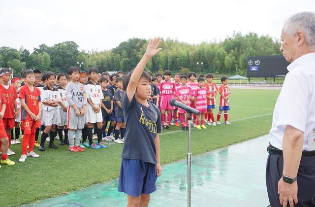 開会式では、主催者の滋賀報知新聞社の冨田正敏社長と東近江市サッカー協会の周防清二副会長が激励。続いて昨年優勝のSV ROHDIAのキャプテン福永陽大(ひなた)さん=5年生=が選手宣誓で、「正々堂々と戦い抜くことを誓います」と表情を引き締めた。